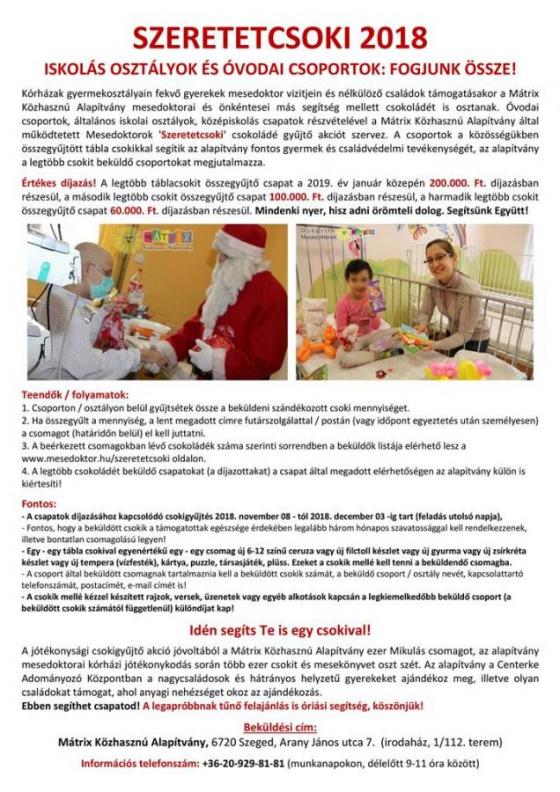 Óvodai csoportok, általános iskolai osztályok, középiskolás csapatok részvételével a Mátrix Közhasznú Alapítvány által működtetett Mesedoktorok 'Szeretetcsoki' csokoládé gyűjtő akciót szervez. A csoportok a közösségükben összegyűjtött tábla csokikkal segítik az alapítvány fontos gyermek és családvédelmi tevékenységét, az alapítvány a legtöbb csokit beküldő csoportokat megjutalmazza.
